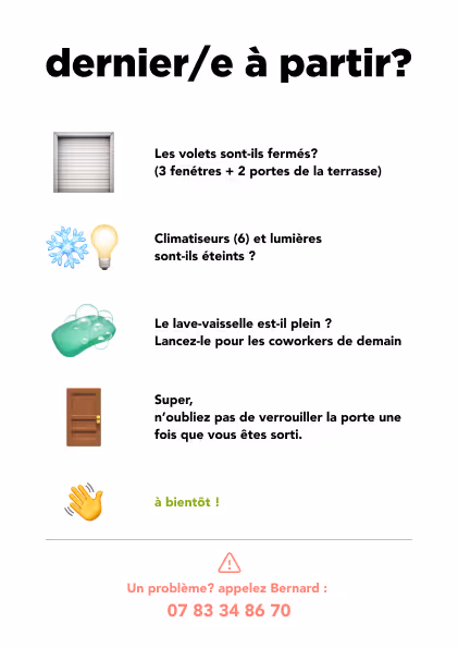 Encore une fois Assurez-vous de les fermer lorsque vous êtes le dernier à quitter l'espace de coworking.